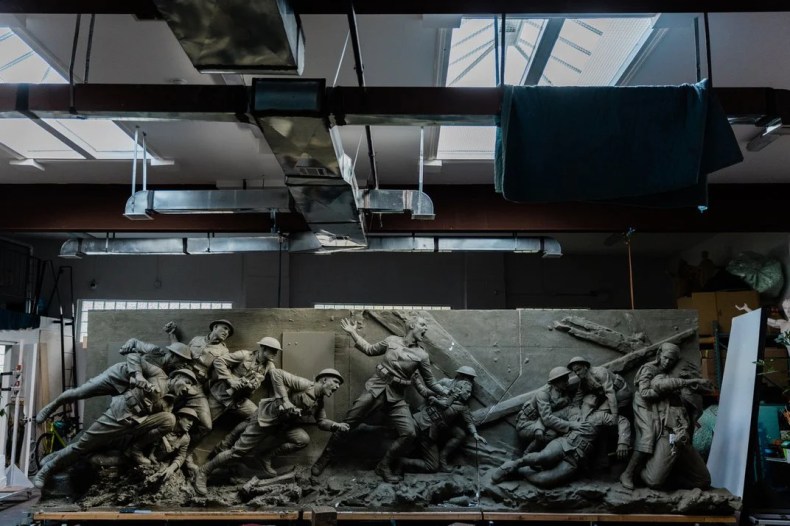 Awaiting the sculptors’ touch are claycoated foam armatures for a “battlefield Pietà,” with soldiers cradling a fallen comrade. Beside them a nurse tends to a soldier gassed in combat.